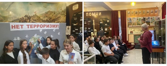 [color=#a52a2a;]3 сентября, в День солидарности в борьбе с терроризмом, в Андроповском музее прошел Час Памяти "Россия против террора". Обучающиеся 6 класса курсавской школы им. Ф. Г. Буклова узнали о Бесланской трагедии, унесшей жизни сотен людей. На мероприятии присутствовала Григорьева А. В. - секретарь АТК по Андроповскому округу. Анна Викторовна рассказала ребятам, как не стать пособниками террористов, какую ответственность несут преступники, связанные с организацией и проведением терактов и какие меры безопасности может предпринять каждый в борьбе с распространением терроризма. Среди обучающихся были распространены антитеррористические буклеты и календари.[/color]